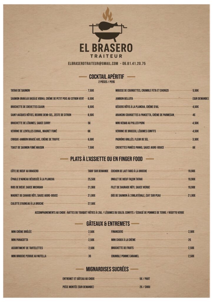 Bienvenue Chez El Brasero ! Plongez dans une expérience gastronomique authentique, ancrée dans le terroir de Marolles-en-Brie. Chaque plat est méticuleusement composé avec des ingrédients provenant de nos partenaires locaux : brasseur de l’Essonne, maraîcher et boulanger du Val de Marne. Ici, le circuit court est notre philosophie, et chaque bouchée témoigne de notre passion à transformer ces trésors locaux en créations culinaires uniques